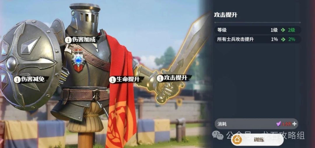 2. 兵种属性提升在练兵场中花费慧晶能够提升生命、攻击、伤害加成和伤害减免。