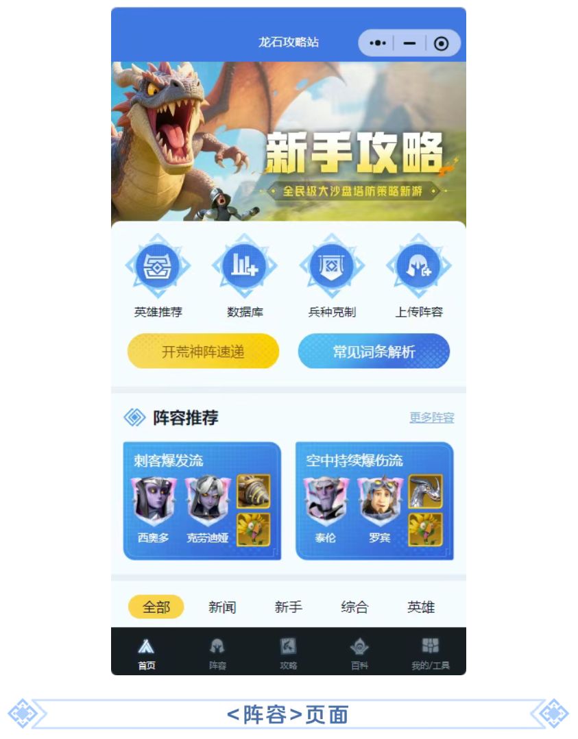 首页为攻略站导航页面,领主们可以轻松查找最新官方攻略和热门阵容推荐,还有动态更变的开荒神阵速递和常见词条解析能帮助大家轻松过渡前期困难~其他功能欢迎领主们进入小程序中一探究竟,幻龙宝宝就不一一赘述了。