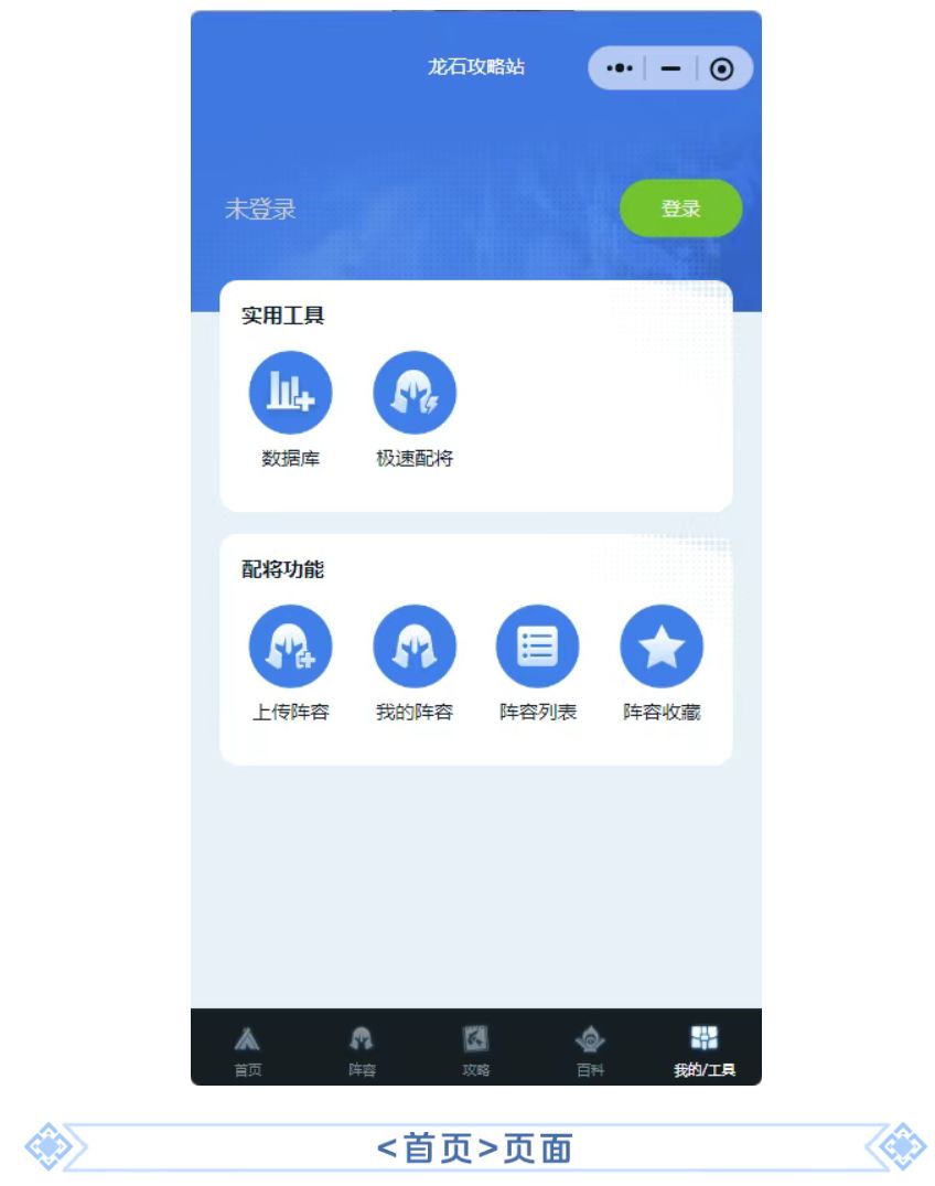 各位领主可以通过微信小程序搜索「龙石攻略站」进入攻略站后,点击底部「我的/工具」可以完成首次登录绑定,在此页面下,各位领主可以轻松跳转各种实用功能页面,还可以对领主喜爱的阵容进行收藏,方便反复观看~
