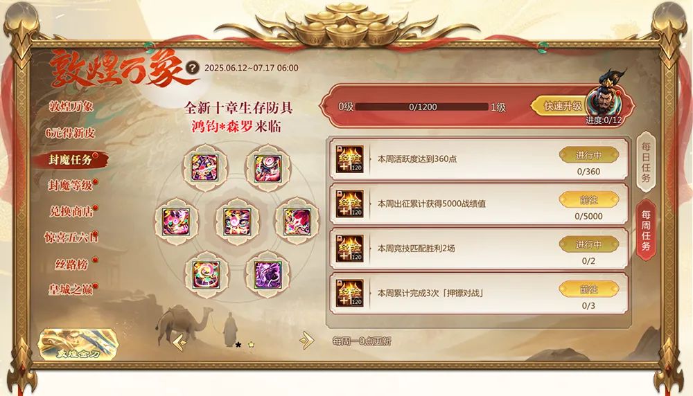 活动期间,完成每日任务、每周任务可获取封魔战功,用于提升封魔等级,领取海量万象玉和各种珍贵奖励!(错过每日任务可通过找回领取奖励)