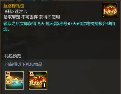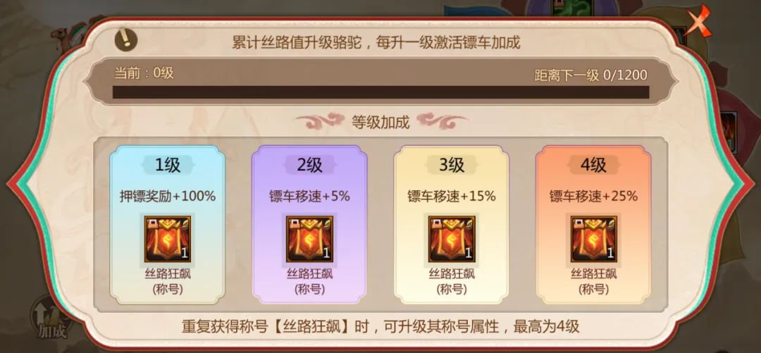 等级奖励为称号【丝路狂飙】,重复获得丝路狂飙系列称号,可令称号升级,最高为4级。