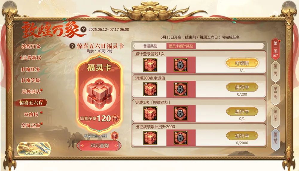 活动期间,惊喜五六日任务在每周五六日开启,开启时间内,完成任务可领取出征机巧奖励。