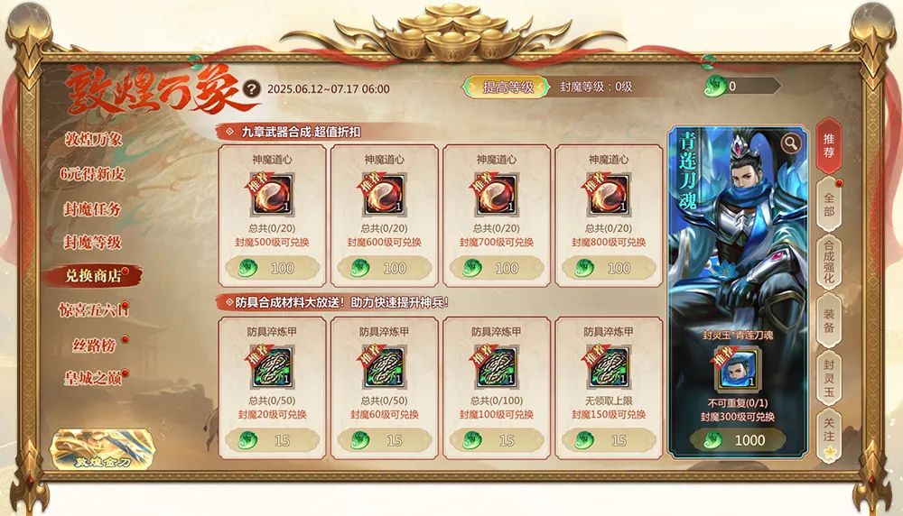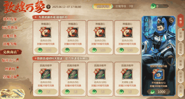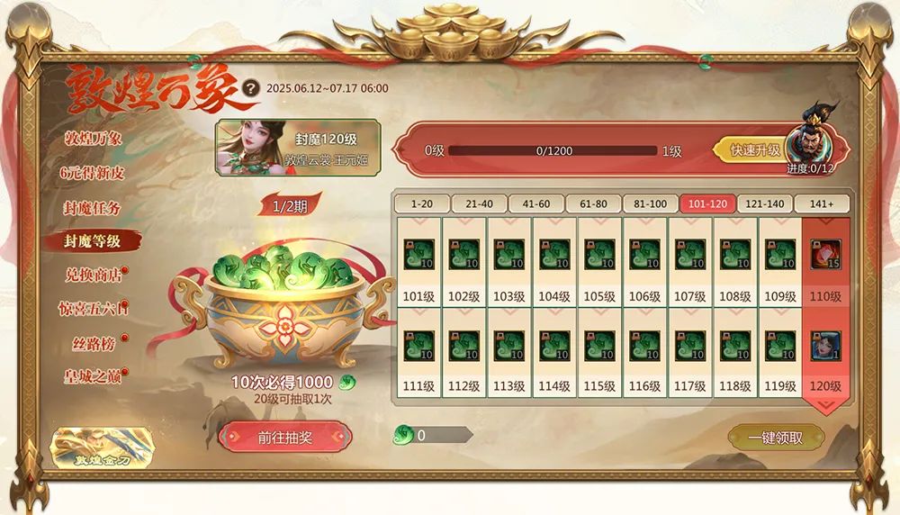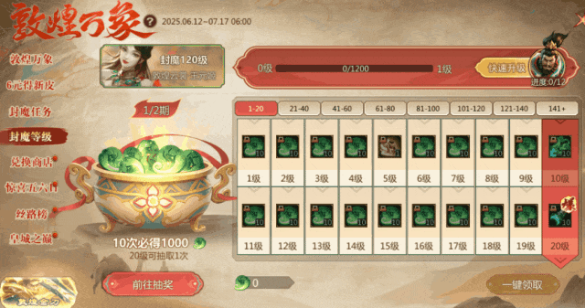 活动期间,提升封魔等级可在此领取【万象玉】,消耗万象玉可在商店中兑换丰厚奖励!