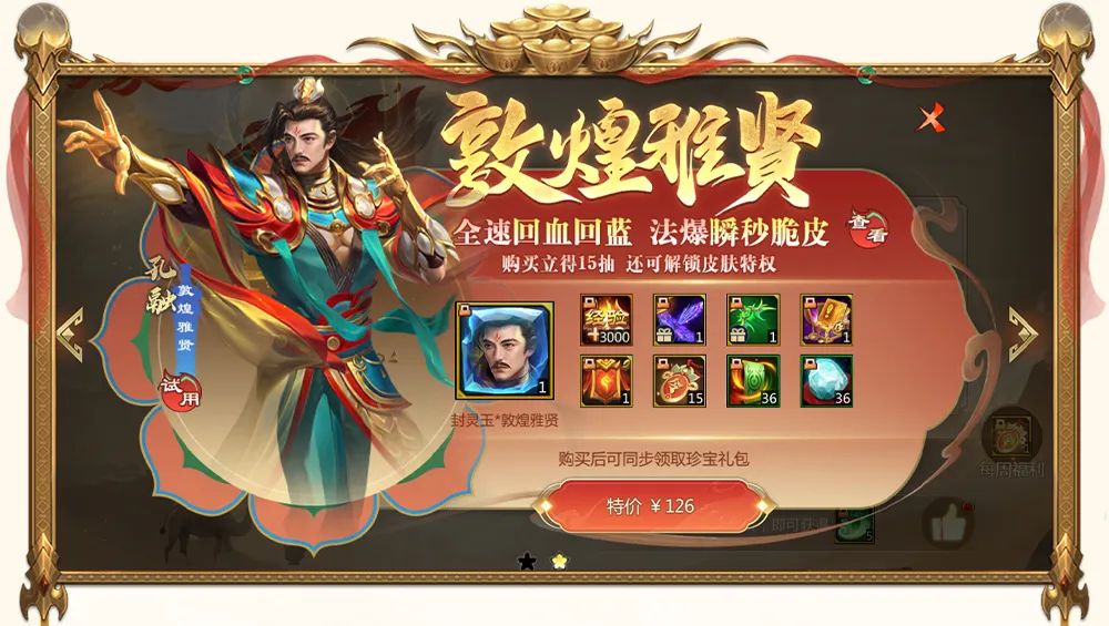 全速回血回蓝,法爆瞬秒脆皮,孔融全新换装——敦煌雅贤,超值126礼包上架!购买立得15抽飞天令~(礼包完整内容见上图)
