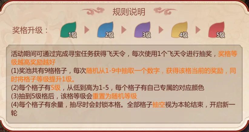 完成寻宝任务获得【飞天令】,每次使用1个飞天令进行抽奖,可以从1~9格子中抽取一个格子,获得当前格子中的奖励。同时,该格子等级会提升1级,奖格等级越高,奖励越好!(格子不同颜色代表不同的奖励稀有程度,详情见下图说明)