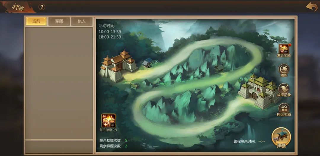 2.每天有2次押镖次数和5次劫镖次数,玩家可选择自己押镖或突袭他人劫镖。