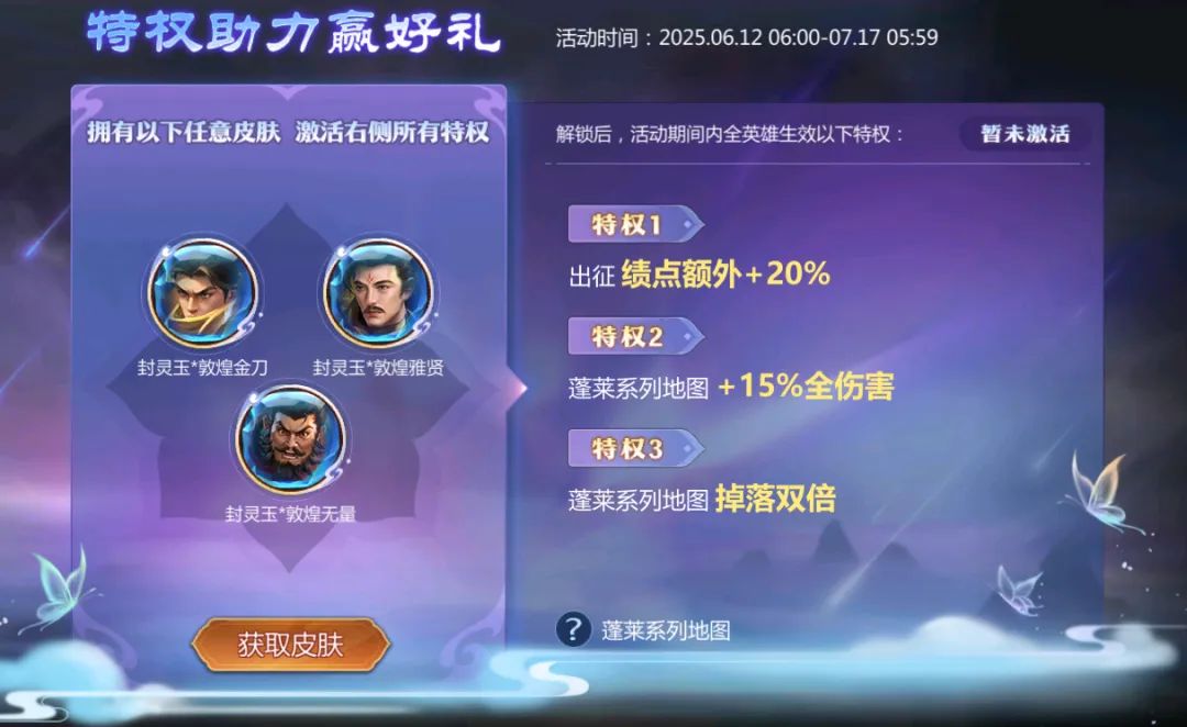 注:皮肤特权可生效的蓬莱系列地图包含:极夜幻境、蓬莱陷阵、蓬莱幻洞、蓬莱极境、长生殿*干机
