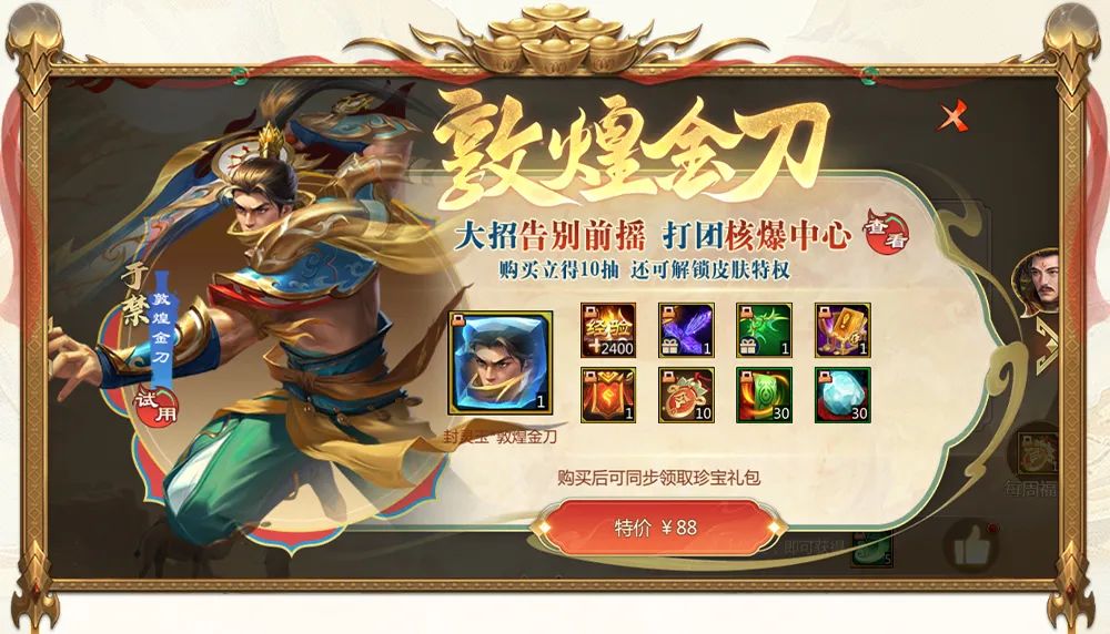 告别大招前摇、打团核爆中心,于禁全新换装——敦煌金刀,特价88礼包限时上架!购买立得10抽飞天令,还可解锁蓬莱皮肤特权!(礼包完整内容见上图)