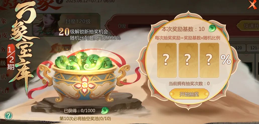 封魔等级达指定等级时可解锁一次万象宝库抽奖机会,万象宝库共有2期,每期抽满10次必将抽空当前奖池,两期总计有万象玉*2500可拿!