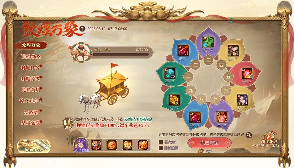 1.前往敦煌万象活动提升骆驼等级,可解锁运镖玩法的奖励加成和移速加成,即押镖/劫镖奖励翻倍和镖车行驶时间更短。