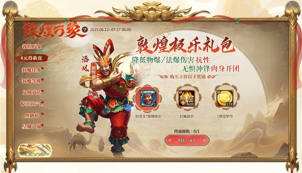 购买立得最新换装潘凤*敦煌极乐、封魔战功*600、绑定梦币*128!肉身开团更无畏,且看我凤哥能否次次技能全中逆袭?!