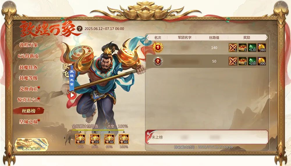 敦煌万象记录军团丝路值,活动期间榜单共结算两次,取得前三名的军团将在皇城战中获得增益加持,还有丝路榜礼包、大量补魂玉和研习丹!