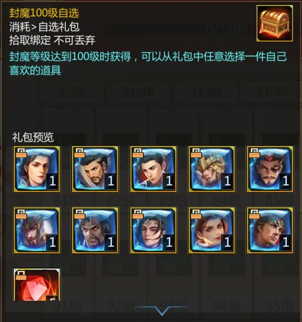 ▼ 封魔等级100级时,可领取封灵玉自选礼包*1