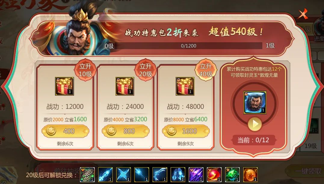 购买战功折扣包,立升封魔等级,买足一定数量可领取封灵玉:张飞*敦煌无量!
