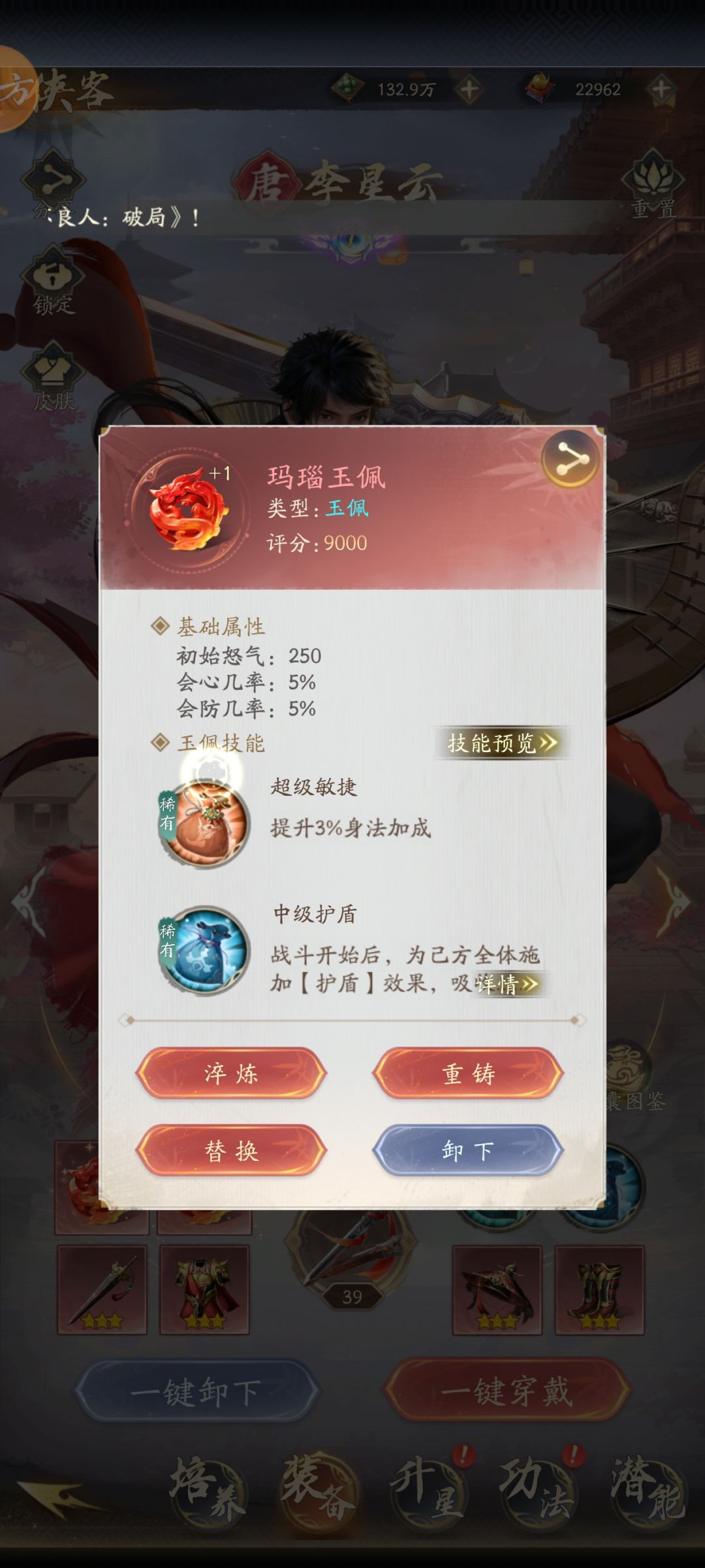 然后就是玉佩方面的,橙色的一定不要洗浪费资源,合成红色+1后洗个一个可以用的技能就行,基础优先怒气和身法