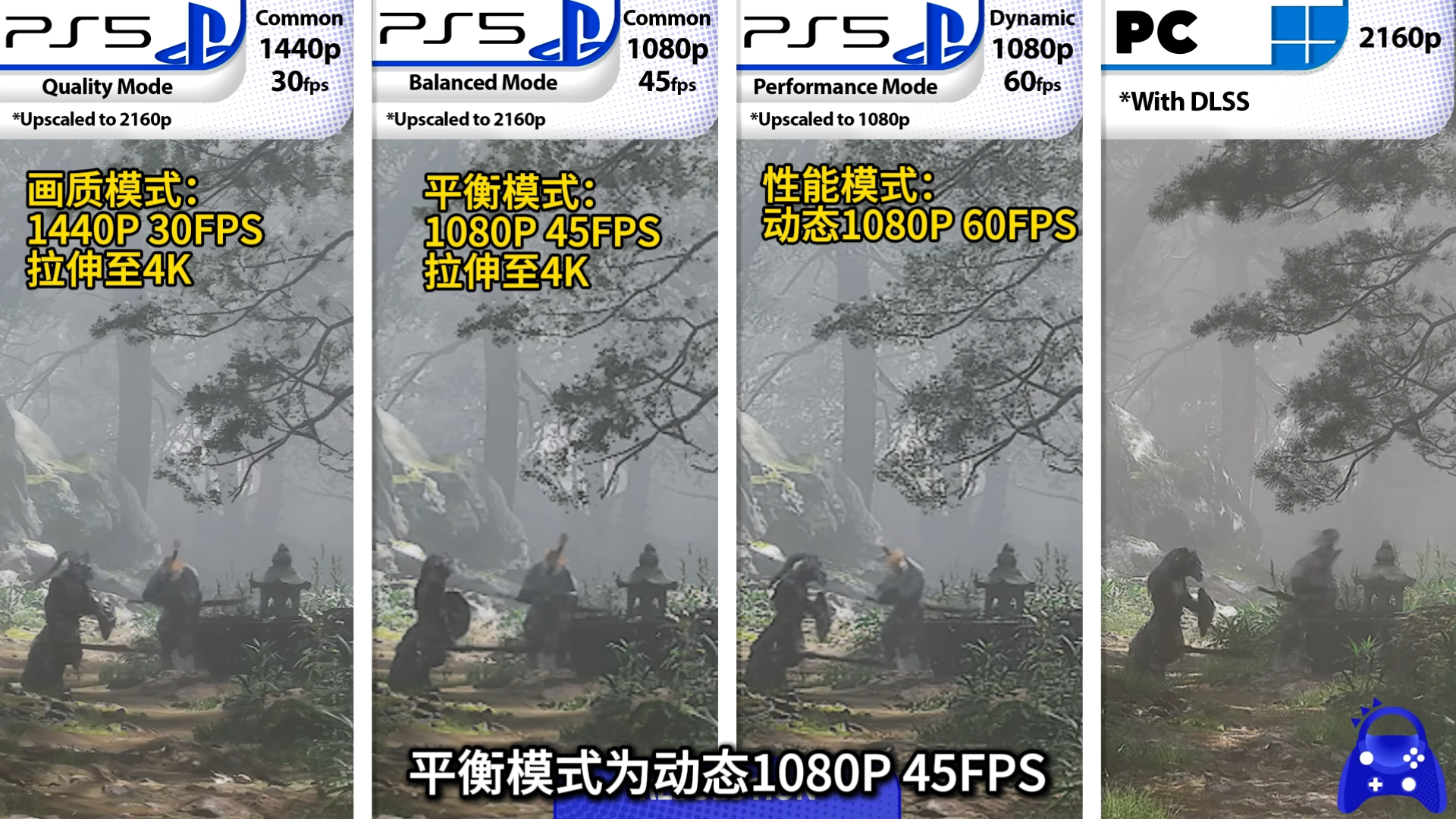 这次游戏在PS5上一共提供了三种模式。性能模式为动态1080P 60FPS;平衡模式为动态1080P 45FPS;画质模式为动态1440P 30FPS。性能模式的60帧,是通过帧生成的方式,把30帧强行拉到60帧,非常暴力!这也带来一个问题,我们后面再说。平衡模式和性能模式的分辨率在拉伸后都达到了“4K”。