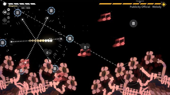 一部分游戏里有必然出现的红色物体、包含墙壁、剑、发射物等弹幕内容,需要你在其中快速躲避,同时收集可以资源,然后发动攻击。