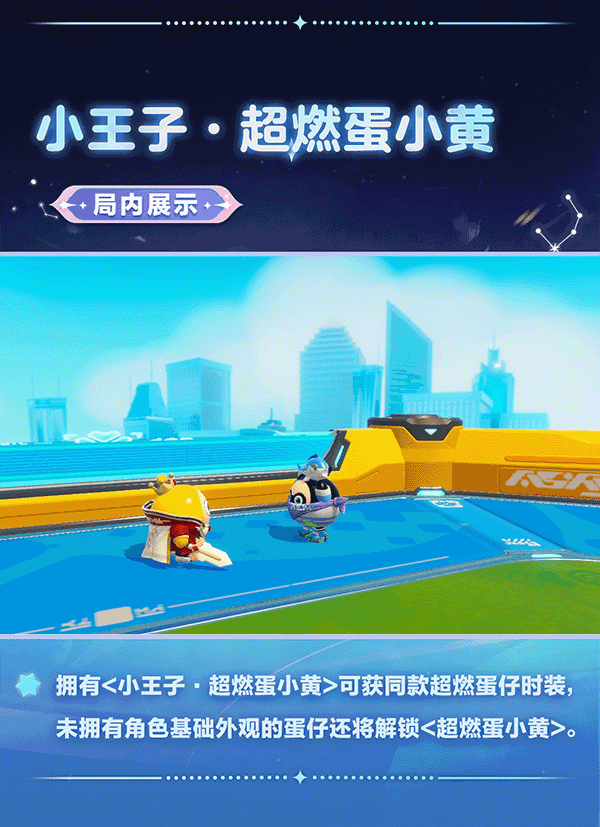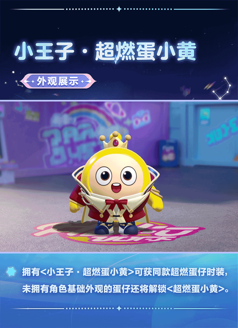 🤴限时两周5折特惠,购买超燃蛋小黄·小王子系列幻想时装即可获得同款超燃时装。活动期间打包购入还将立减120蛋币,仅需120蛋币即可超值拿下外观、配饰、超燃蛋仔时装及同款武器时装,共计四大好物! 此外,未拥有蛋小黄基础外观<超燃蛋小黄>的玩家,购买幻想时装后还可额外附赠基础外观~
