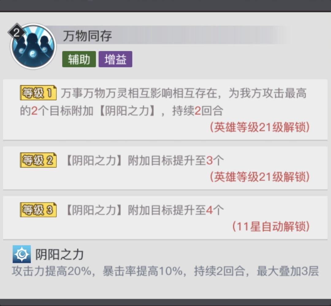 *【阴阳之力】:攻击力提高20%,暴击率提高10%,持续2回合,最大叠加3层。