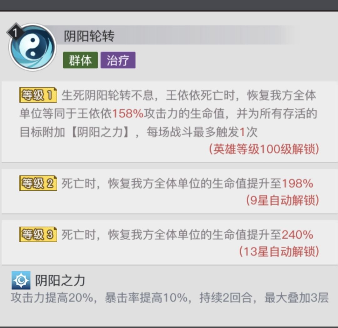 生死阴阳轮转不息,技能满级状态下,王依依死亡时,恢复我方全体单位等同于王依依240%攻击力的生命值,并为所有存活的目标附加【阴阳之力】,每场战斗最多触发1次。