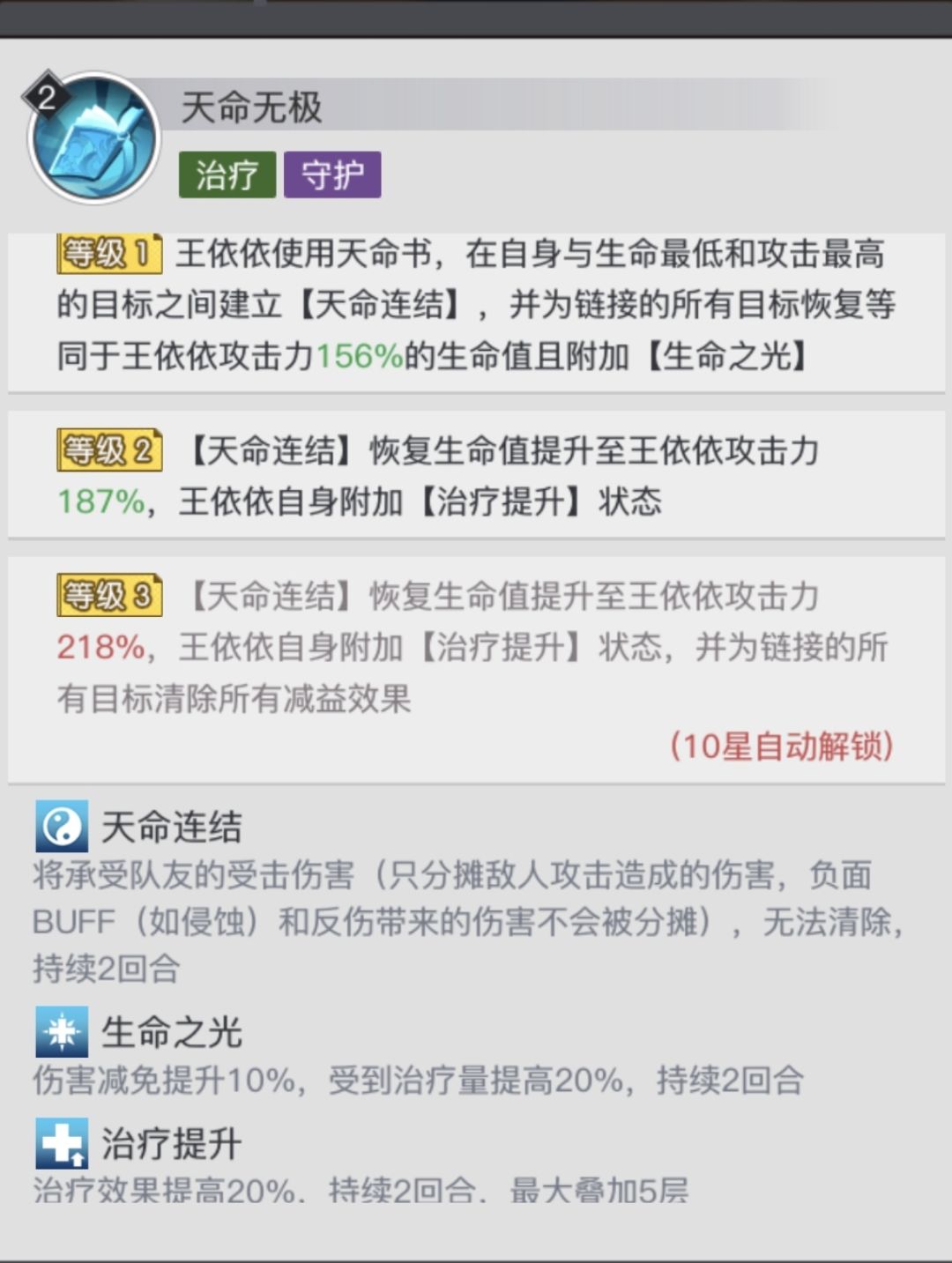 王依依使用天命书,在自身与生命最低和攻击最高的目标之间建立【天命连结】,并为链接的所有目标恢复等同于王依依攻击力156%的生命值且附加【生命之光】,天命连结将承受队友的受击伤害(只分摊敌人攻击造成的伤害,负面BUFF(如侵蚀)和反伤带来的伤害不会被分摊),无法清除,持续2回合。
