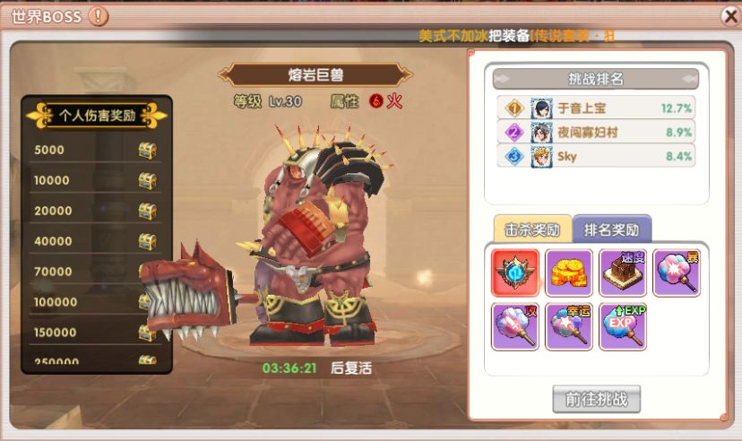 世界领主(每晚八点开启,伤害排名越高奖励越丰富,击杀还有额外奖励)