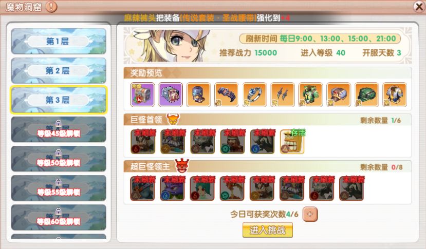 魔物洞窟(每天早上九点、下午一点、三点、晚上九点刷新超巨怪领主,可获得装备、附魔卡等)