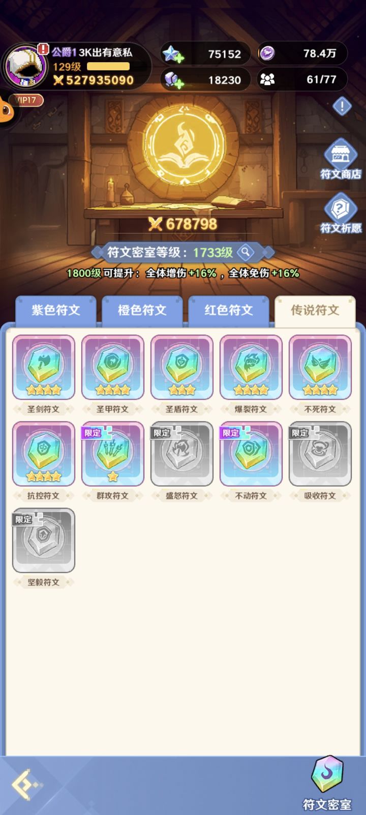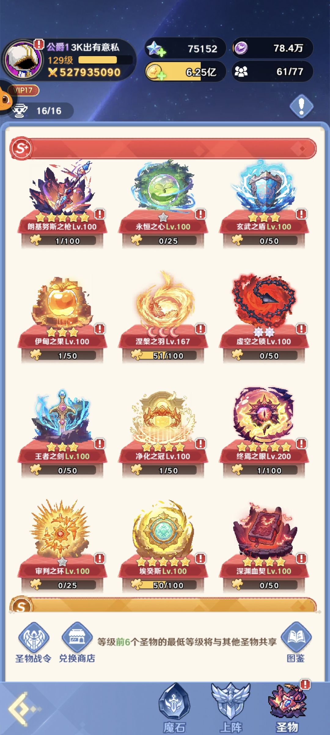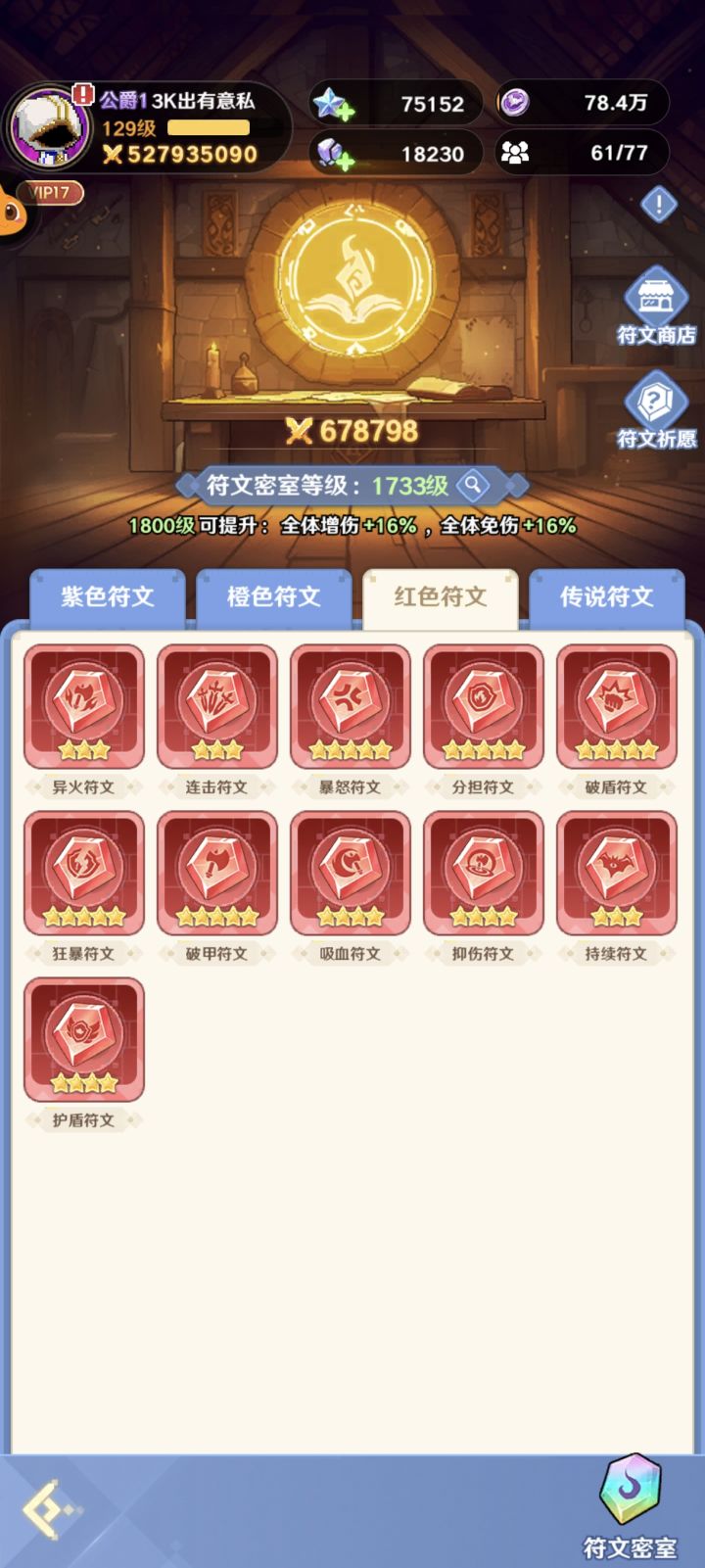 该有的都有了,稳定榜一。详情如图,15星痕虚空,核心符文,魔宠,圣物。开区一个多月