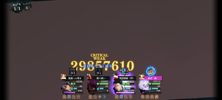 第一回合:狗卷2+回想、领域惠3、夏油2、五条1+回想。第二回合:狗卷2、领域惠3+回想、夏油2、五条1。第三回合:狗卷和领域惠开大、夏油2、五条1。第四回合:狗卷1、领域惠1、夏油2、五条3。第五回合:校长2+回想、领域惠1、夏油2、五条3。第六回合校长2、领域惠1、夏油2、五条大招+回想