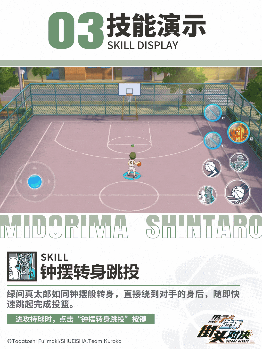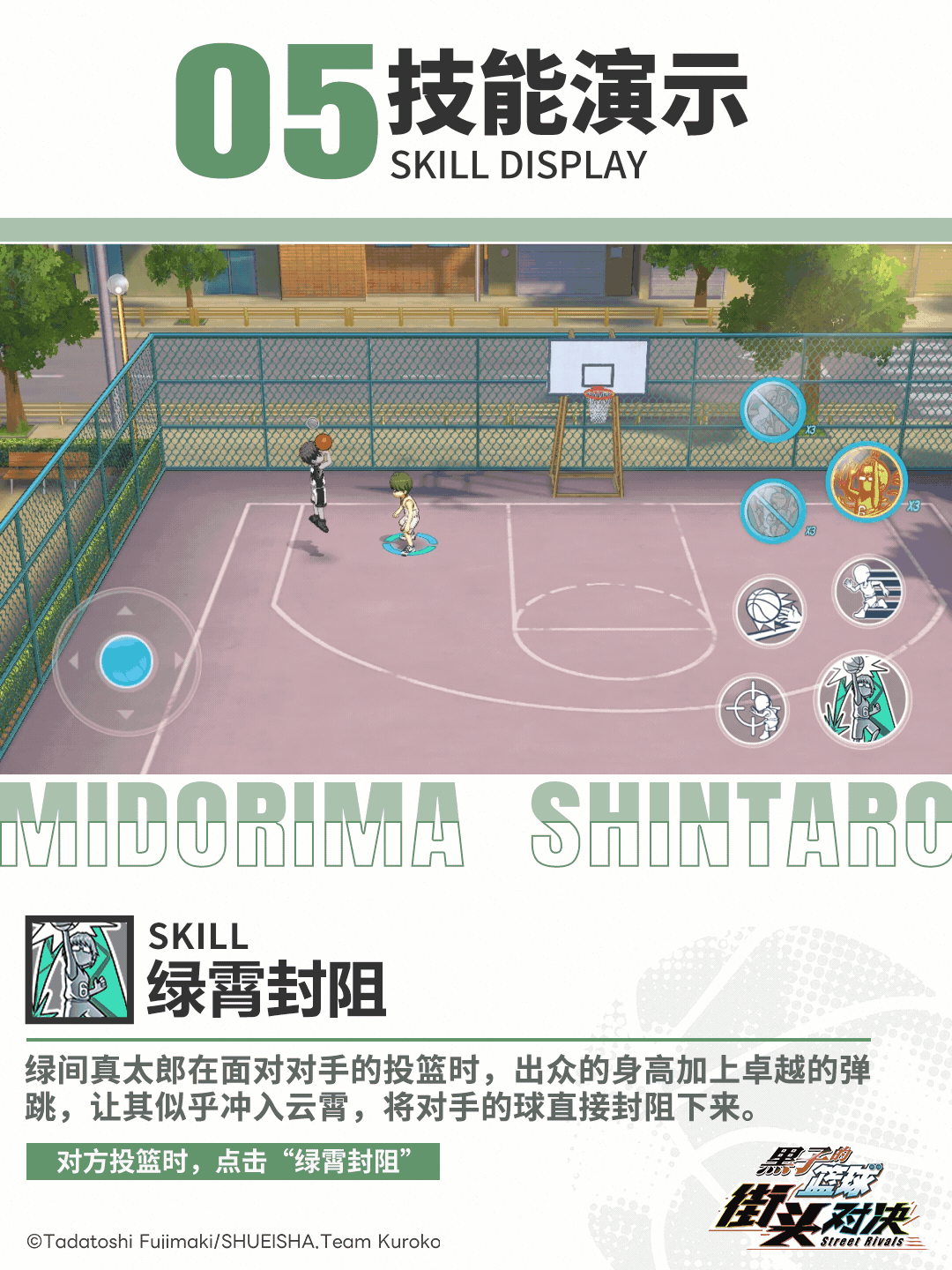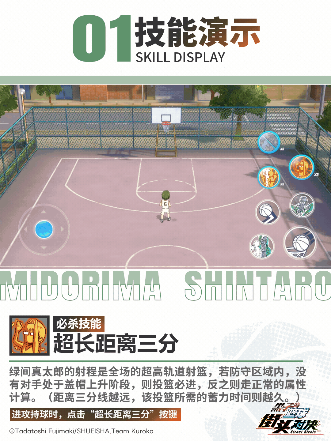 绿间真太郎的射程是全场的超高轨道射篮,若防守区域内,没有对手处于盖帽上升阶段,则投篮必进,反之则走正常的属性计算。(距离三分线越远,该投篮所需的蓄力时间则越久。)