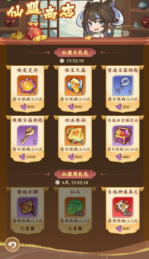 在仙盟中获得个人贡献,可以使用个人贡献换取各式各样的奖励,甚至可以兑换禁地令牌,助力道友获取更多的装备提升战力。其中日礼包每日进行更新,周礼包则是每周进行更新,仙友可以留意商店界面的倒计时噢~
