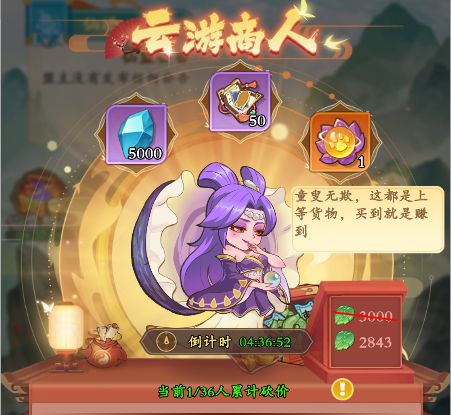 在仙盟中也会有云游商人来访,云游商人每天会带来不同的商品,仙盟中的道友均可以进行砍价,每次砍价都会降低商品的价格,各位道友齐心协力,一同砍价,甚至可以将商品的价格砍成负数,从而额外获得仙玉,道友记得喊上您的小伙伴一起砍价哦~
