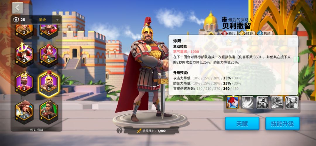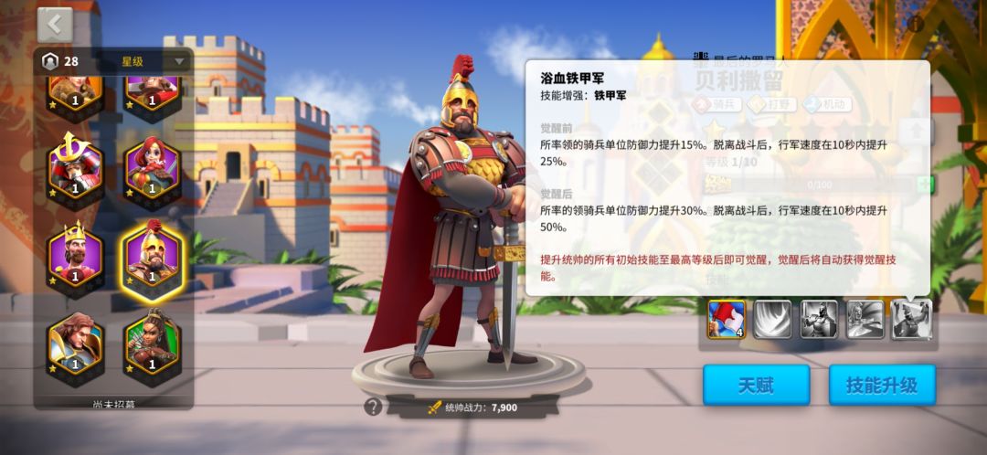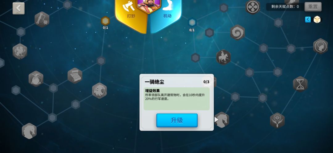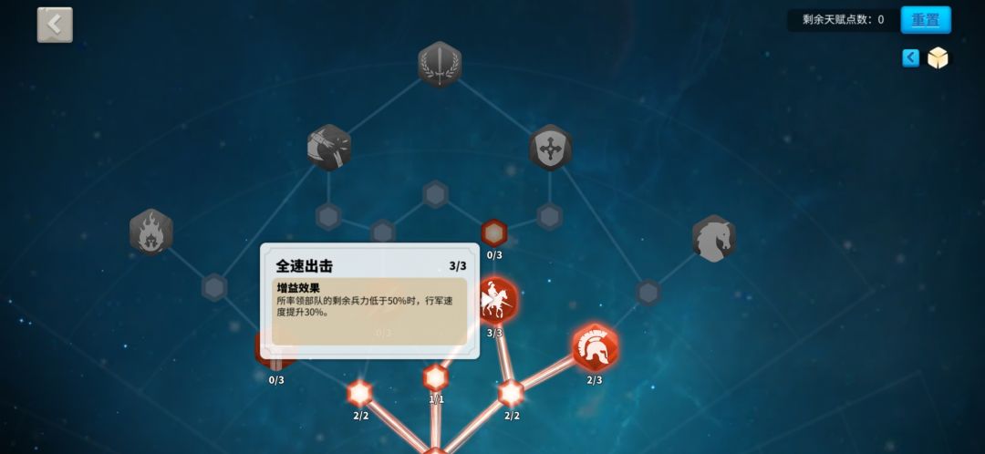 注意一点,当你的部分兵也少于百分之50,也是可以加百分之30移速的。贝利撒留,优先机动拉满,然后点出全速出击,之后的可以慢慢点骑兵基本天赋。