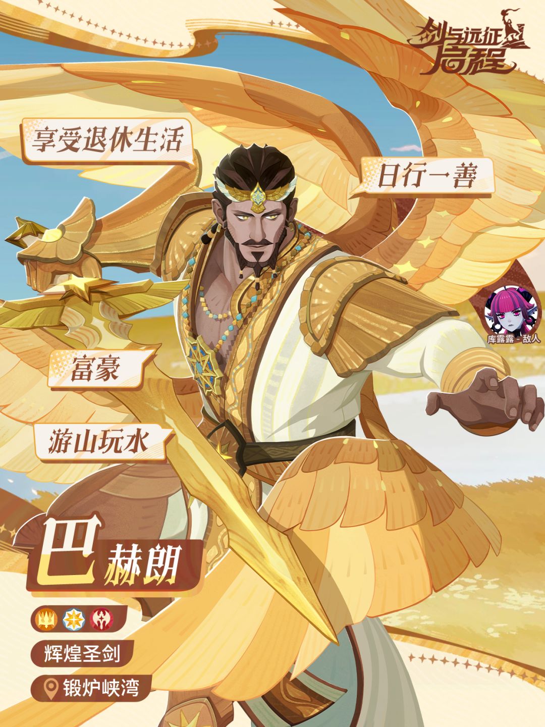 巴赫朗曾是一个强大的战士,如今则在某个城镇悠闲自得地享受着他的退休生活。游山玩水和广施钱财是巴赫朗目前最大的爱好。