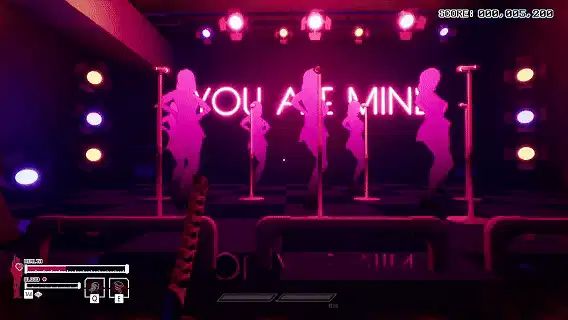 美术组将霓虹效果与漫画相结合,强烈的青粉对比色调,给人很强的视觉冲击,其作画风格也十分大胆,暴力美学在动作系统的体现更为出“色”。