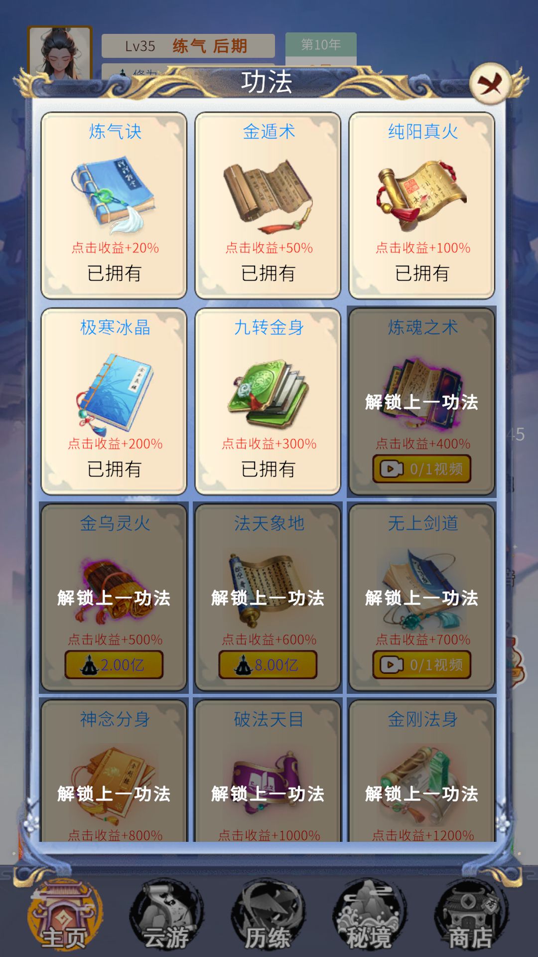 整体重新安装了3次,不到两百广告,最后一次到底还是卡在功法上了无法解锁下一个,不过无所谓了反正成就无法触发,大家注意下跑商背包和元宝看广告每局都更新就是说十几个广看下来就管一局,最好是到整数万元宝的时候再选结束跑商,增加每秒灵石还是有用的。