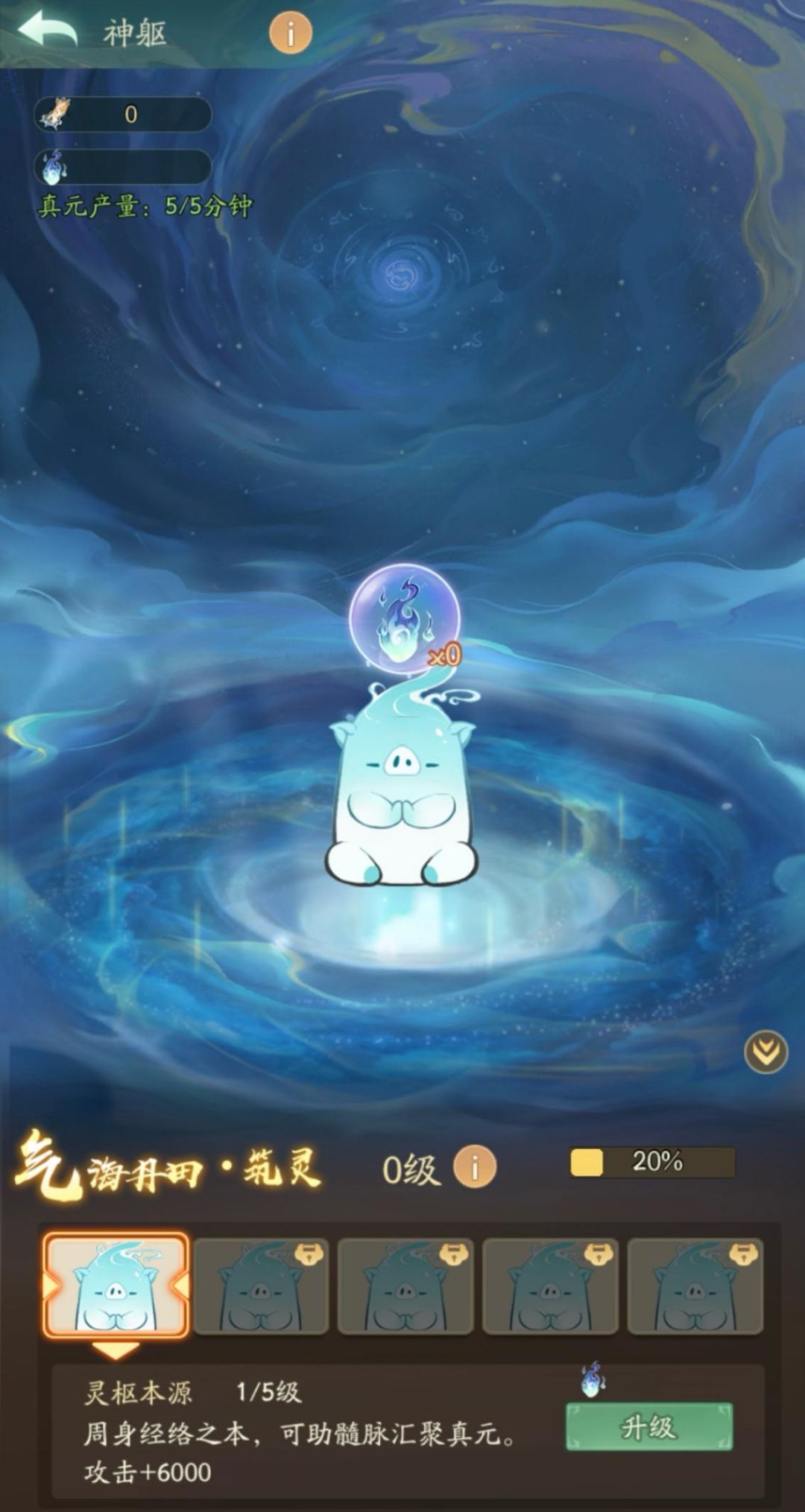 丹田汇天地灵气,蕴元气真力。其内育有五个本源元婴,随着丹田等级提高能解锁更多元婴数量。