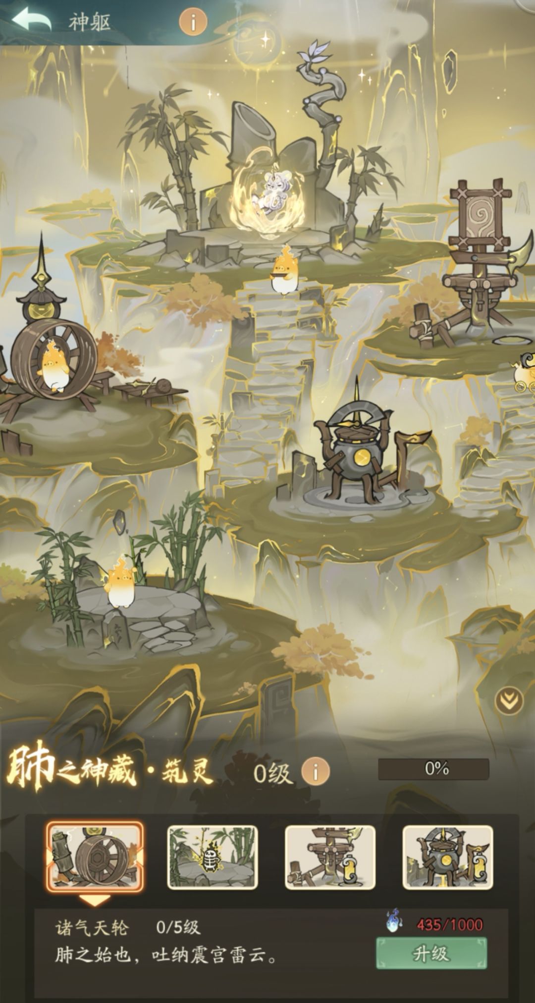 每个五脏分为四个道宫,道友需以真元滋养,逐级提升道宫等级。道宫等级达到上限后需升级神藏突破限制才可继续升级。
