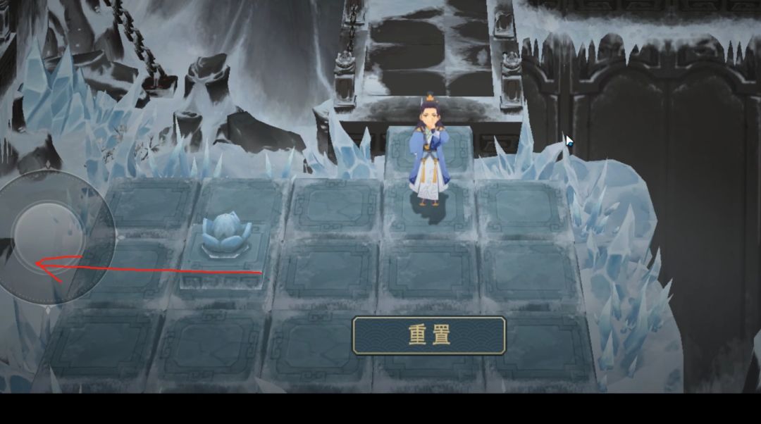 过完阵之后我们继续向上,来到封印柱前,与之交互。修复完成之后我们原路返回,此时还会碰到冰蚂蚁,打法和前面一样,这只蚂蚁后面有一条新路,我们过去,来到一个阵前,解法如下: