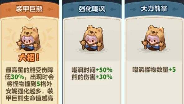 选择大招词条【装甲巨熊】,【强化嘲讽】,【大力熊掌】等词条,提升安妮召唤熊的嘲讽能力,以便更好得配合河掌柜进行输出。