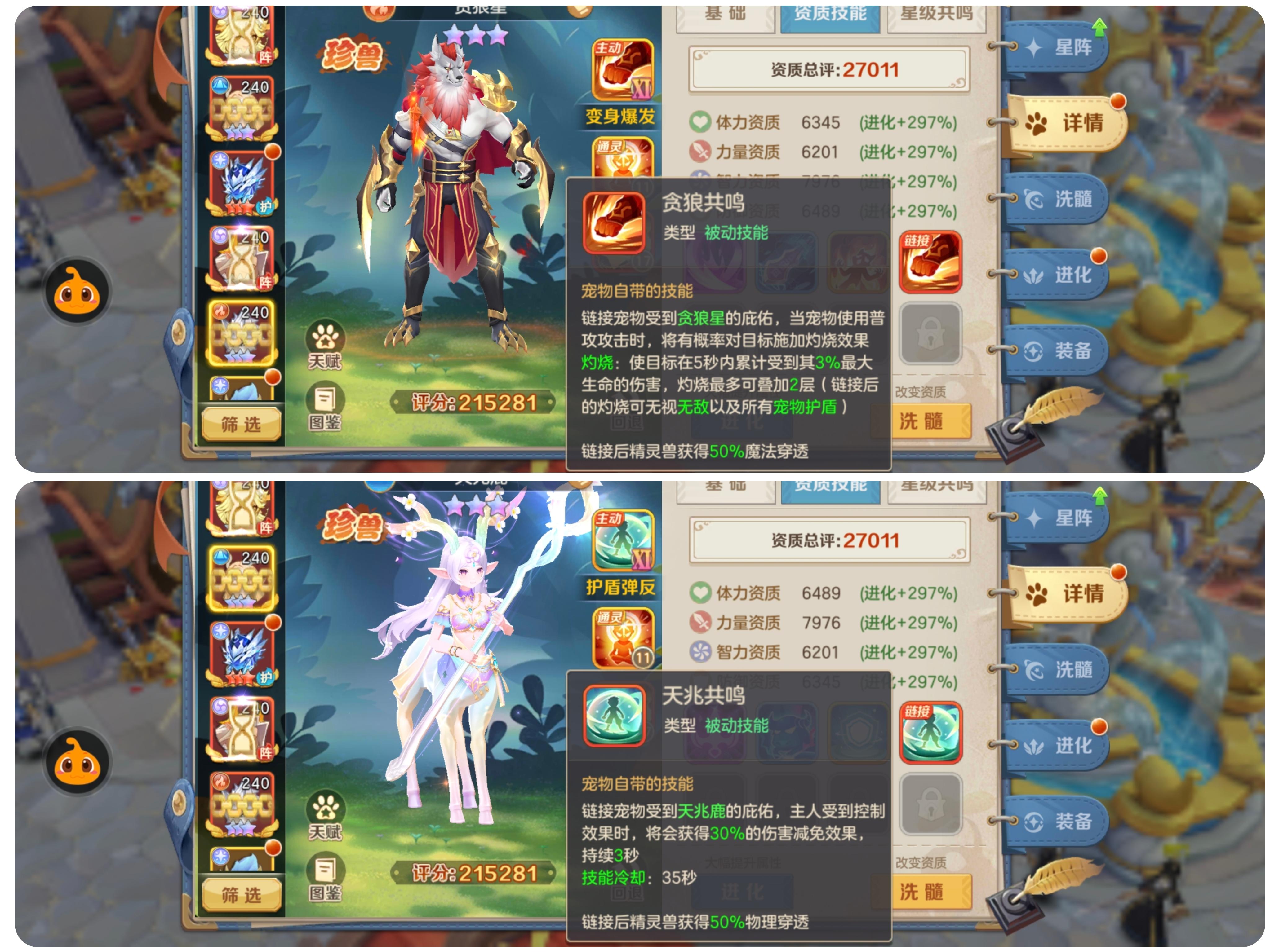 首先珍兽贪狼星和天兆鹿链接精灵兽后,精灵兽附带50%物理和魔法穿透(要区分精灵兽是物理系还是法系,链接错误不生效),如果说新增的宠物伤害穿透是针对人物角色来说,那么这个穿透倍率就会最终变成50+91=141%明显是不合理的,这意味着人物角色的防御完全成为摆设,那么宠物的伤害打人会更痛,虽然调整了御兽之王和天马座的伤害,但是其他宠物的伤害还是没有变化,所以从这一点来看,无论是实战数据上分析还是从更新初衷上来看,新增的宠物物理和魔法穿透都不会是针对人物角色的,而是宠物本身。