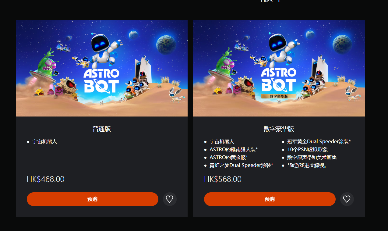 这篇文章,我主要给大家整理了关于本作的一些重要信息,方便你们购前查看。 《宇宙机器人》在PSN商店一共有两个版本。普通版售价468港币(约427元),仅包含本体。豪华版售价568港币(约518元)。除了本体,还赠送了ASTRO亚楠猎人装、ASTRO黄金服、霓虹之梦,Dual Speeder涂装。10个PSN虚拟形象以及数字原声带和美术画集。