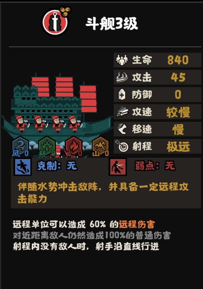 斗舰攻击低,生命射程高。主要是一种压战损的工具,打断对方冲锋和戳击,利用生命死,射程,仇恨值高这些优势消耗敌人,保护友军。