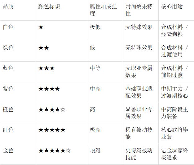 ②紫色:开始区分职业特性(如辅助的治疗加成、坦克的格挡率),可作为紫色武将的毕业装。