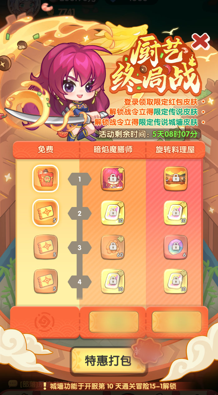 联动限定战令上架,满汉全席等你开餐!活动期间首日签到打卡,即可免费解锁联动主题限定红包皮肤【厨神小当家】。