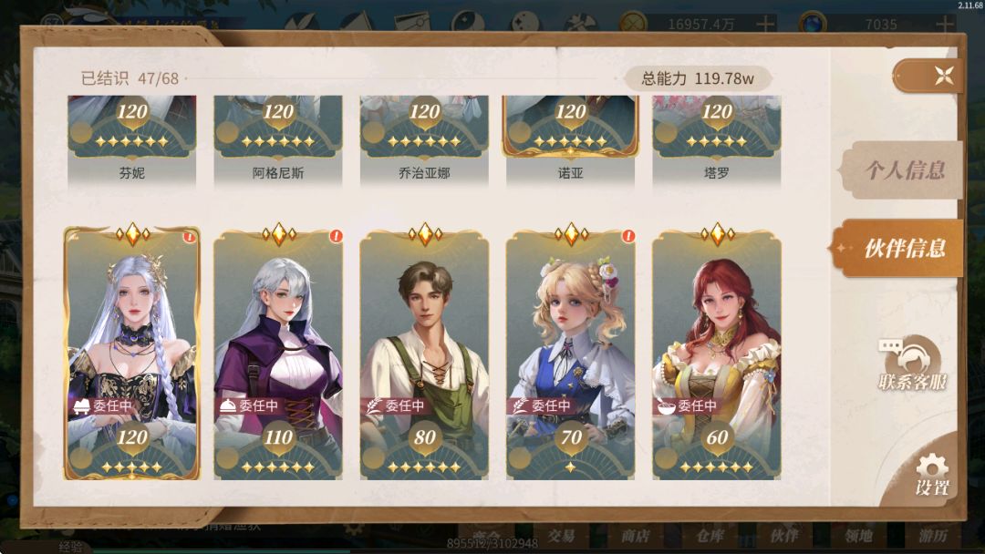 本人当前67级,繁荣度119w,伙伴总能力119w;