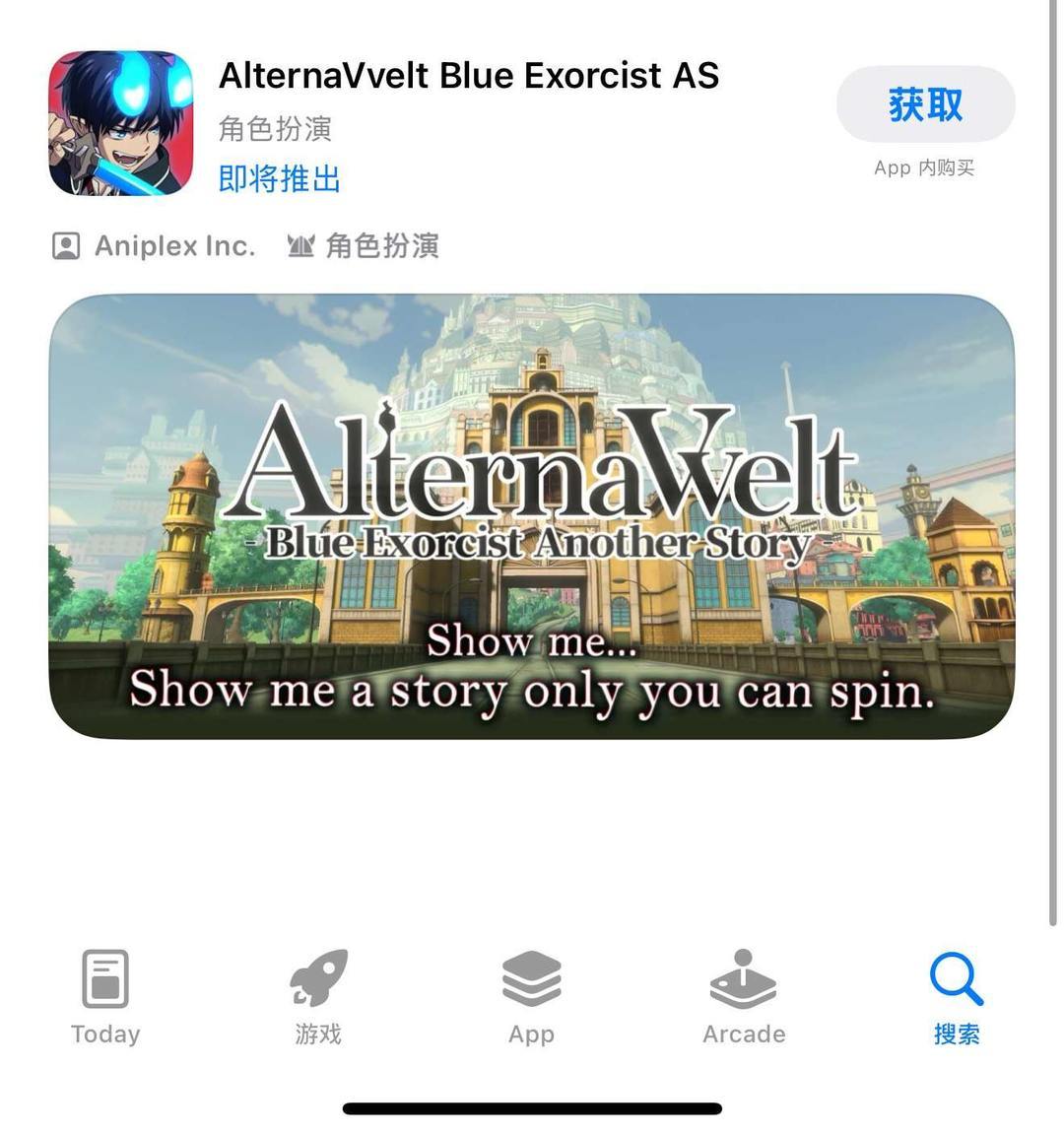 第三步:登录外区Apple ID后,搜索【AlternaVvelt Blue Exorcist AS】即可预约下载游戏哦!(这里以新加坡地区AppS为例)