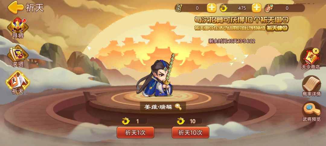 活动内容:活动期间开启祈天招募,使用玉龙玦祈天概率招募神话武将。玉龙玦可在征召商店和特惠商城购买,或者参与运营活动获得。
