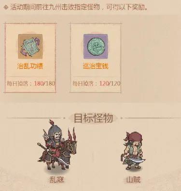 (三)活动技巧1、合理安排时间:活动开启后,尽量每天上线完成任务,获取治乱功绩和巡治宝钱,不要错过每日的获取机会。2、关注活动奖励:除了商店兑换的道具外,活动期间击杀贼寇还能获得元宝、金砖、紫色随机书籍等资源,要积极参与战斗获取这些奖励。3、利用货币囤积:如果活动结束时还有剩余的治乱功绩和巡治宝钱,可以囤积起来,等待下次活动开启再进行兑换,但要注意货币不会刷新,需合理规划。以上是本篇内容,请大家多多关注支持。