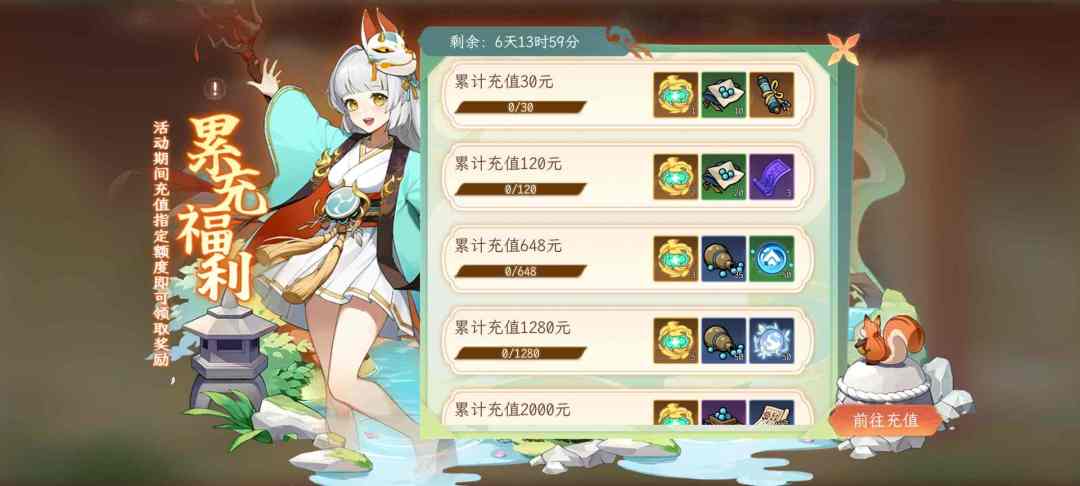 活动内容:活动期间,累计充值金额达到指定数量可以领取充值奖励。